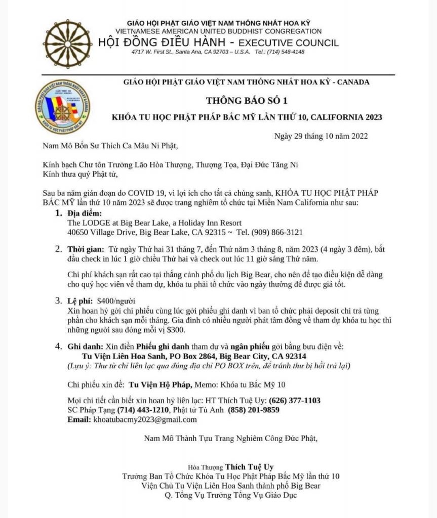 • Thông báo số 2 (khóa tu học Phật Pháp)